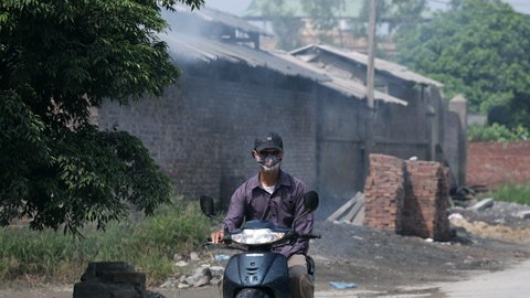 Người dân đi lại trong làng cũng phải đeo khẩu trang để chống lại cái mùi khen khét vừa độc hại, vừa khó thở tỏa ra từ những lò cô đúc nhôm.