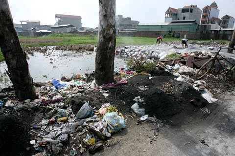 Con đê bên dòng Ngũ Huyện Khê từ lâu cũng trở thành bãi rác thải.