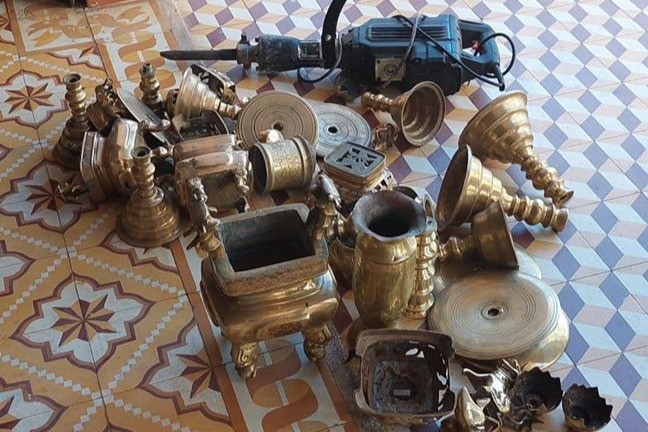 Duy và Dũng cạy cửa, đột nhập vào lăng lấy trộm 3 bộ lư thờ bằng đồng.