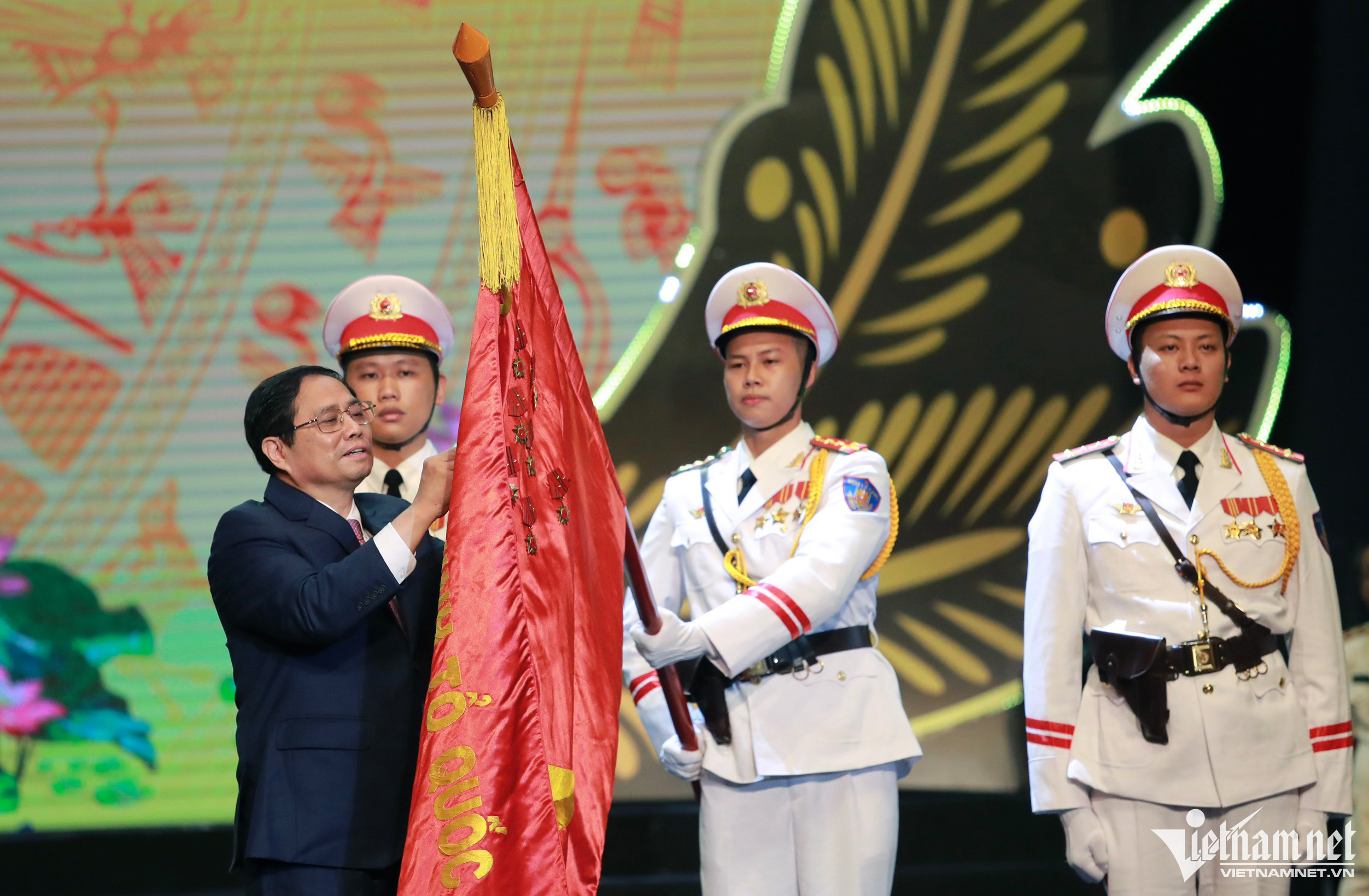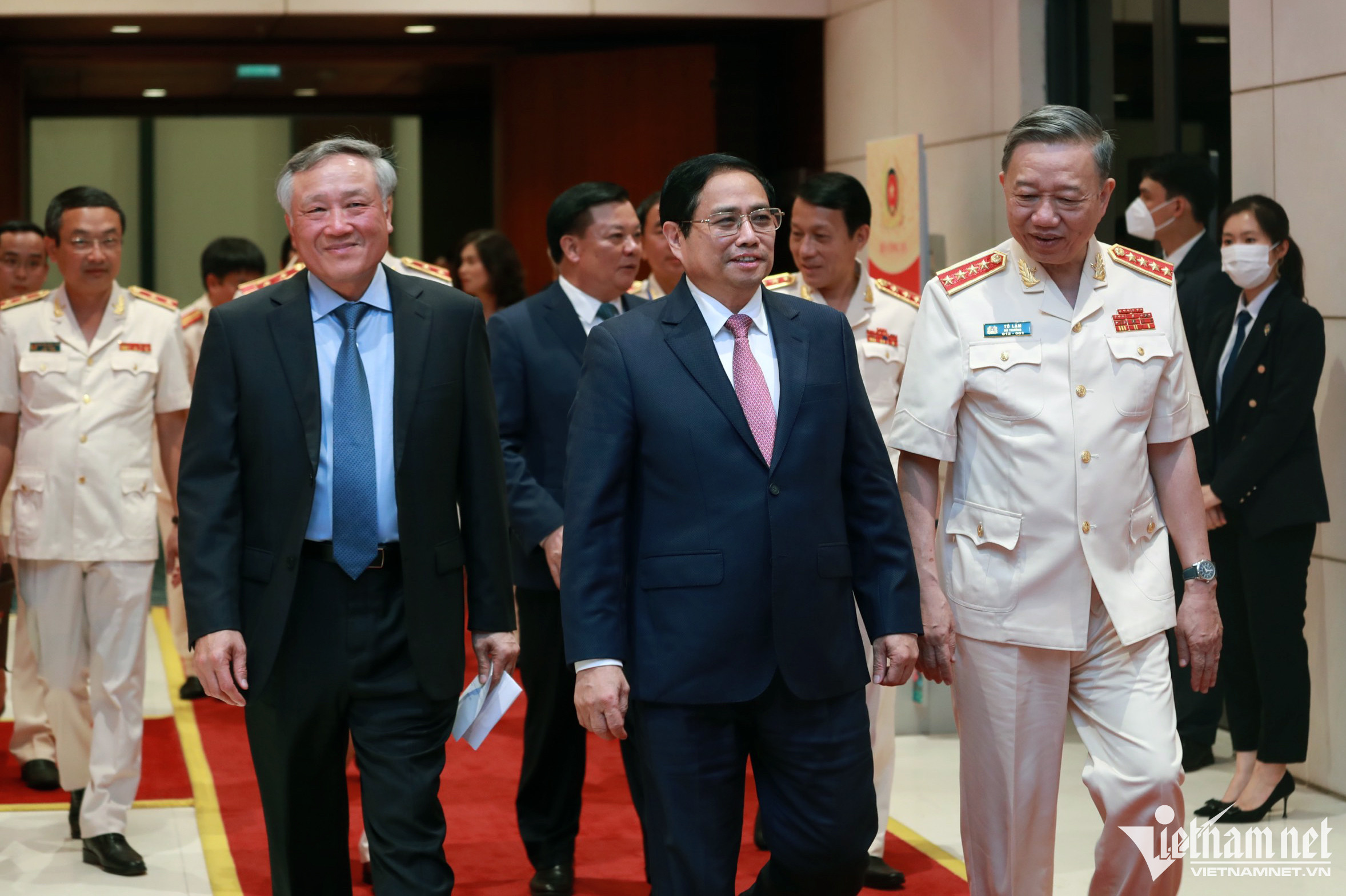 Thủ tướng Phạm Minh Chính, Bộ trưởng Bộ Công an Tô Lâm và nhiều lãnh đạo cấp cao tham dự buổi lễ Kỷ niệm 60 năm Ngày truyền thống lực lượng Cảnh sát nhân dân và đón nhận Huân chương Hồ Chí Minh tại Trung tâm Hội nghị Quốc gia, tối 17/7.