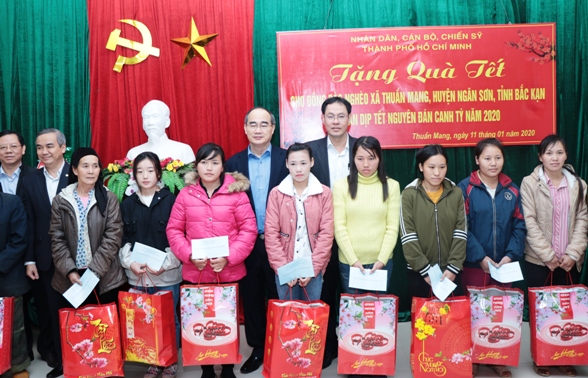 Bí thư Thành ủy TP.HCM cũng tặng 100 suất quà tết cho 100 hộ gia đình nghèo tại xã Thuần Mang, huyện Ngân Sơn; tặng 50 suất quà Tết, mỗi suất trị giá 1 triệu đồng cho các công nhân, viên chức khó khăn tại Trường THCS Huyền Tụng, TP Bắc Kạn.