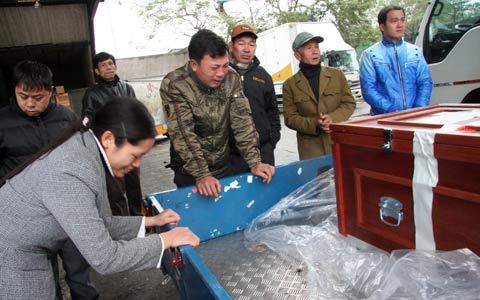 Nhìn thấy quan tài chồng, chị Thu òa khóc nức nở. Chị đã phải đợi suốt 6 tháng kể từ ngày biết tin chồng mất (11/7/2010).