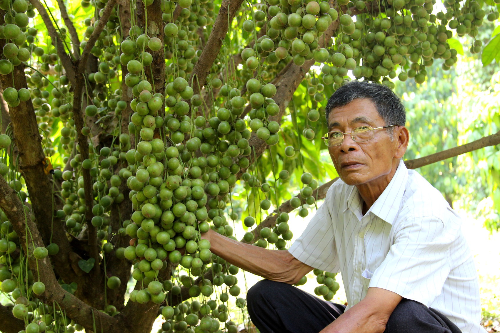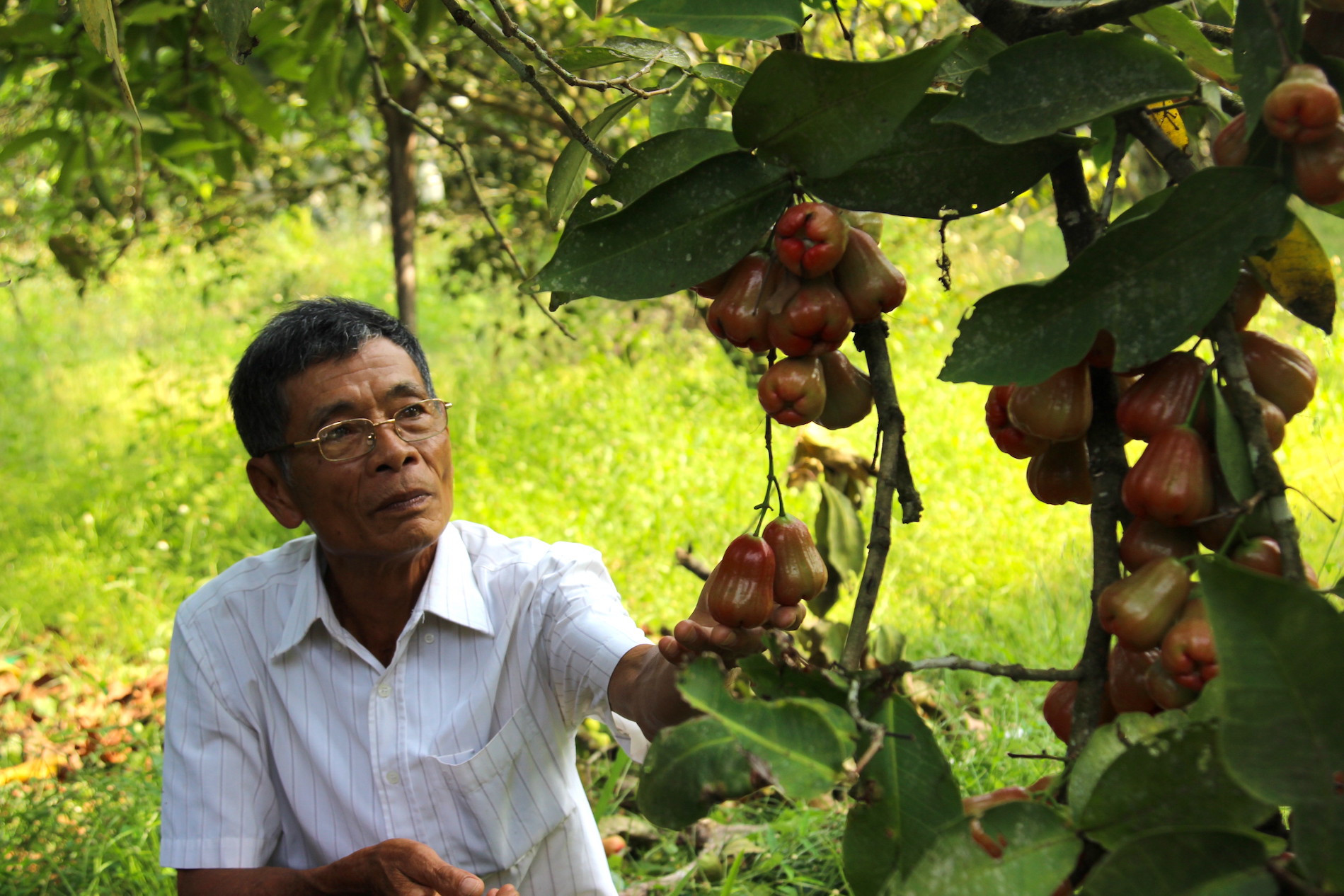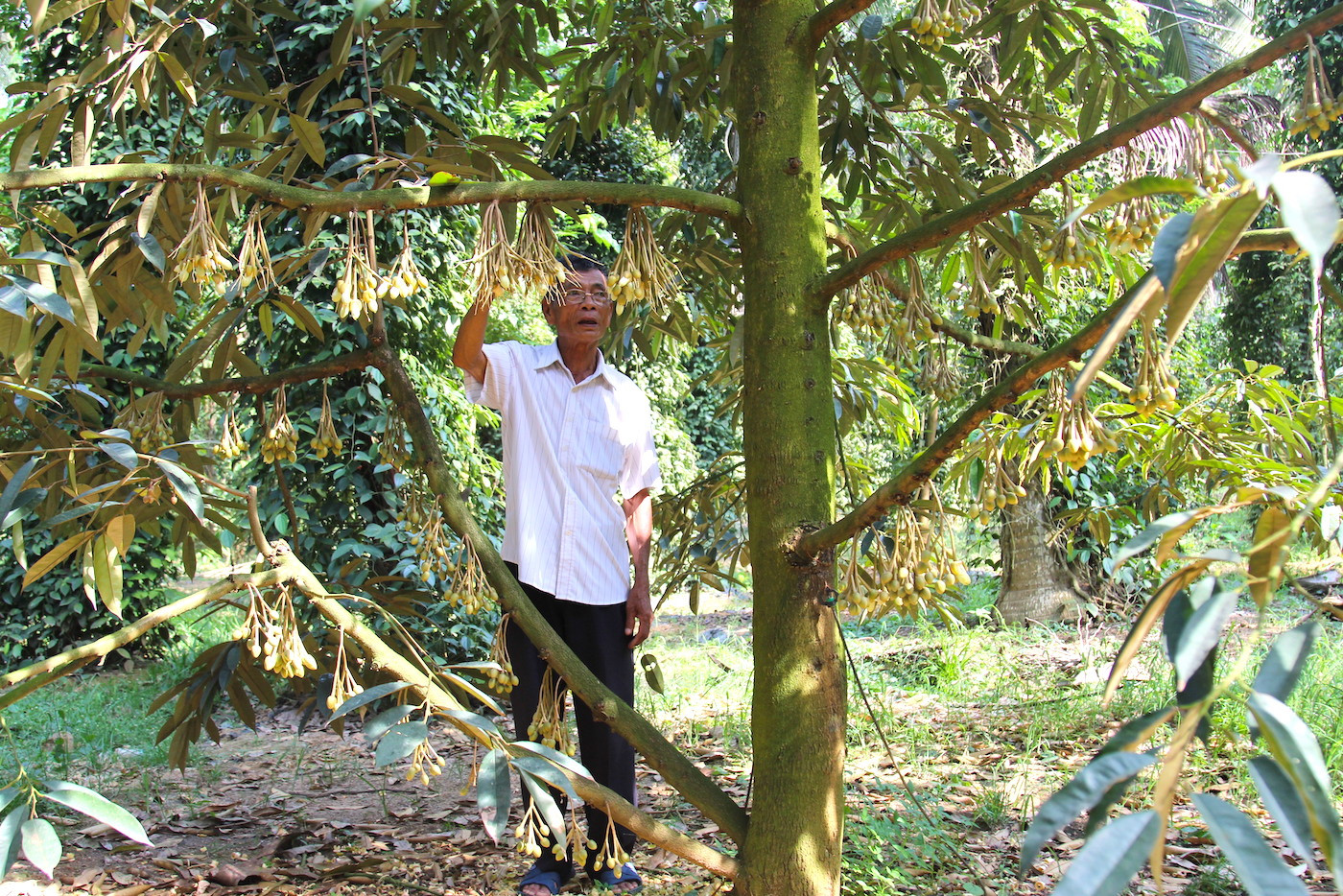 Vừa dẫn chúng tôi vào thăm vườn, ông Cấp hào hứng kể, ông bắt đầu khai hoang làm vườn ở đây từ năm 1989, ban đầu chỉ trồng cây dừa và keo. Sau thời gian chăm sóc, nhận thấy cây keo hút nước, ảnh hưởng đến cây trồng khác nên ông đã phá bỏ.