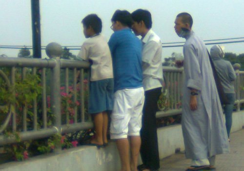 Một thanh niên giả sư xin tiền tại cầu vượt đi bộ gần Suối Tiên (TP.HCM). Vị "sư" này hành nghề từ thứ hai đến thứ sáu, khoảng 4 - 5h chiều; thứ bảy, chủ nhật, hay ngày lễ thì "trụ trì" cả ngày vì thời gian này có nhiều người tới đây vui chơi.