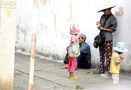 Dưới đây là hình ảnh trước nhà thờ Chí Hòa ở 149 đường Bành Văn Trân phường 7 quận Tân Bình. Người phụ nữ trạc 30 tuổi bồng đứa con nhỏ chừng 2 tuổi, miệng kêu la, bên cạnh là đứa lớn hơn, mệt mỏi gục đầu xuống đường, rất đáng thương. Họ được khá nhiều người cho tiền. Nhưng thực ra chị ta chỉ huy một nhóm trẻ chuyên ăn xin tại nhà thờ.