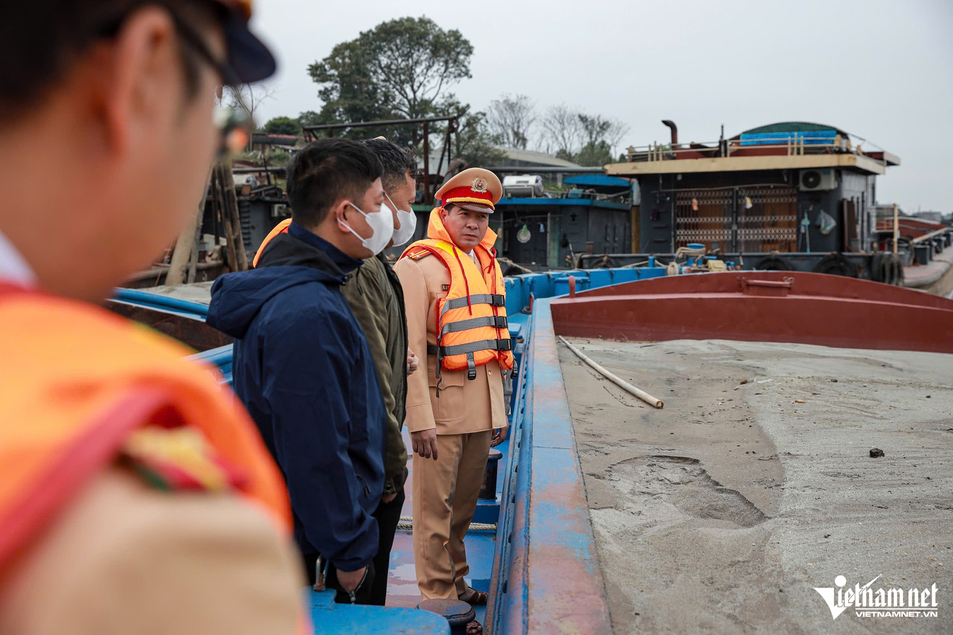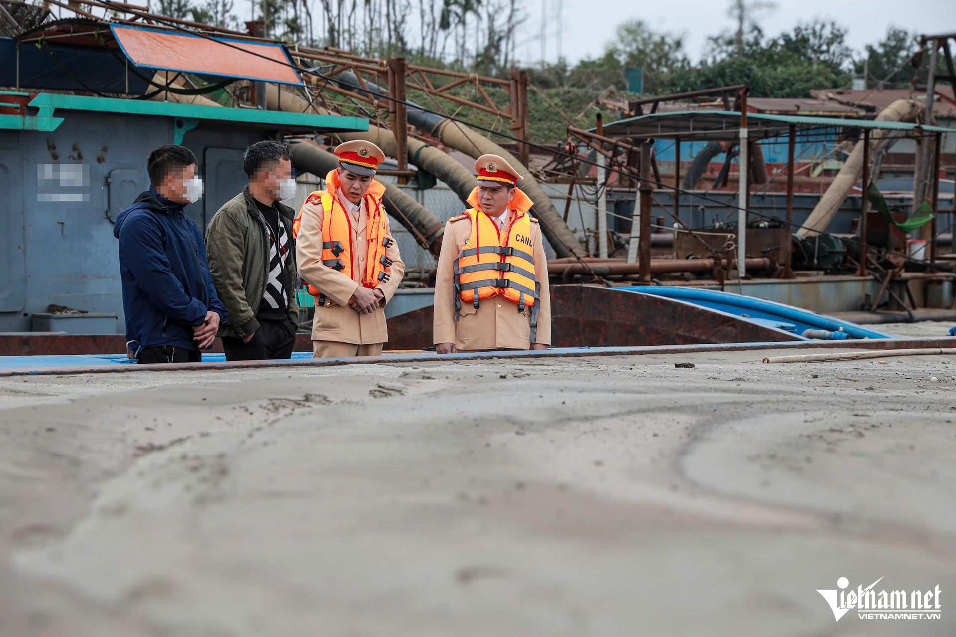 Trên phương tiện này có 4 người, gồm Trần Tuấn A. (SN 1994, trú tại Vĩnh Phúc) là người điều khiển tàu cùng 3 người lao động khác. Trên khoang chứa của tàu này có khoảng 300m3 cát", Trung tá Hưng cho biết.