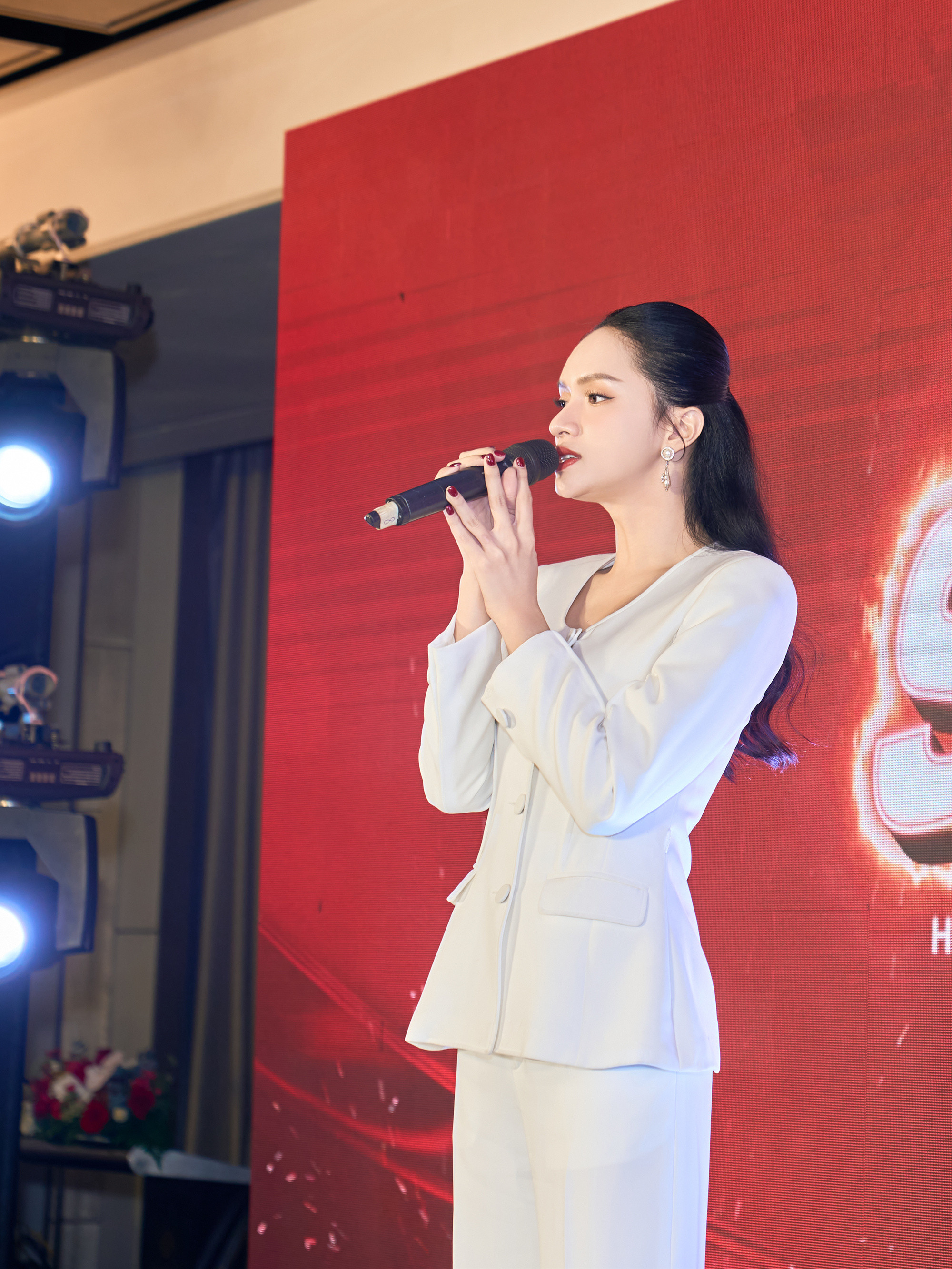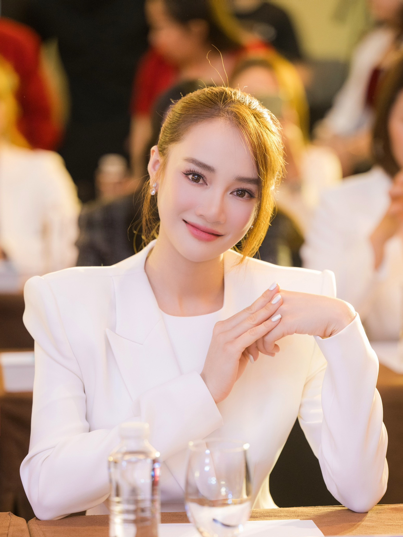 Có mặt tại sự kiện, diễn viên Nhã Phương mặc cây vest trắng, tóc cột cao.