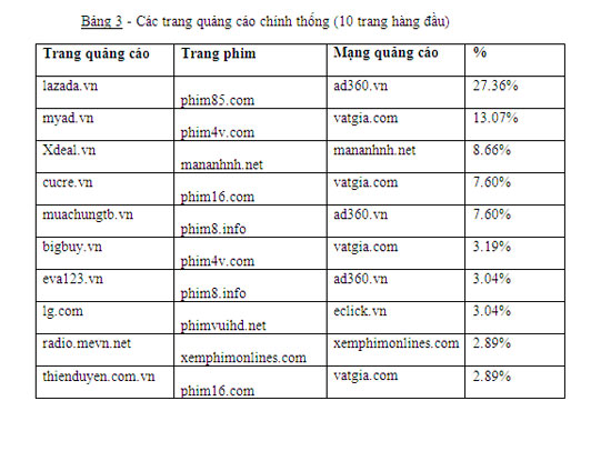 Cũng theo kết quả nghiên cứu mà ông Paul A.Watters công bố, lazada.vn đứng đầu bảng trong số 10 trang quảng cáo chính thống về số lần xuất hiện trên các trang web vi phạm bản quyền ở Việt Nam. Kế đó là myad.vn, xdeal.vn, cucre.vn. Hình ảnh của các tên tuổi lớn này xuất hiện trên các trang web chiếu phim "lậu" thông qua các mạng quảng cáo tự động như ad360.vn, vatgia.vn, eclick.vn...