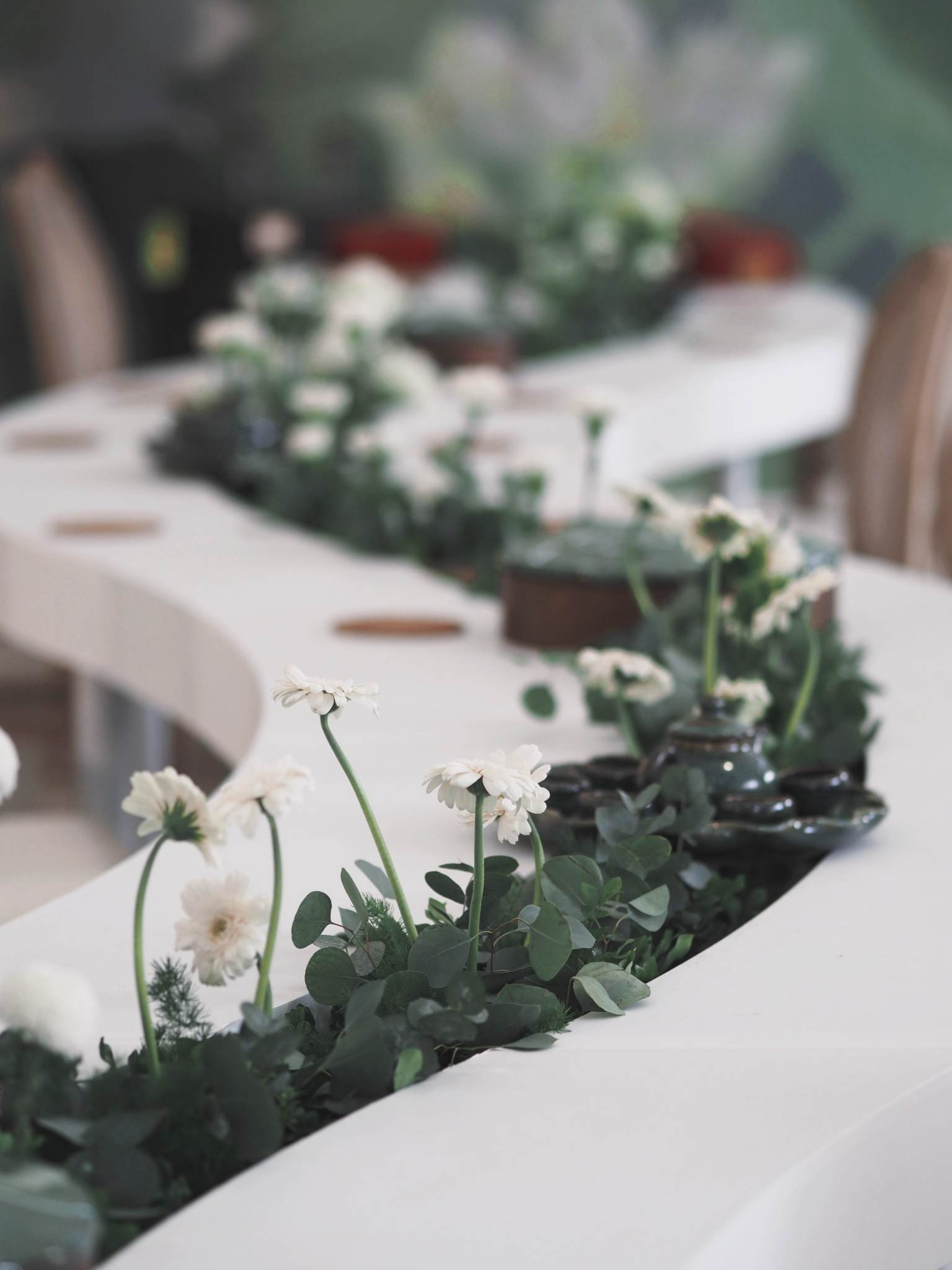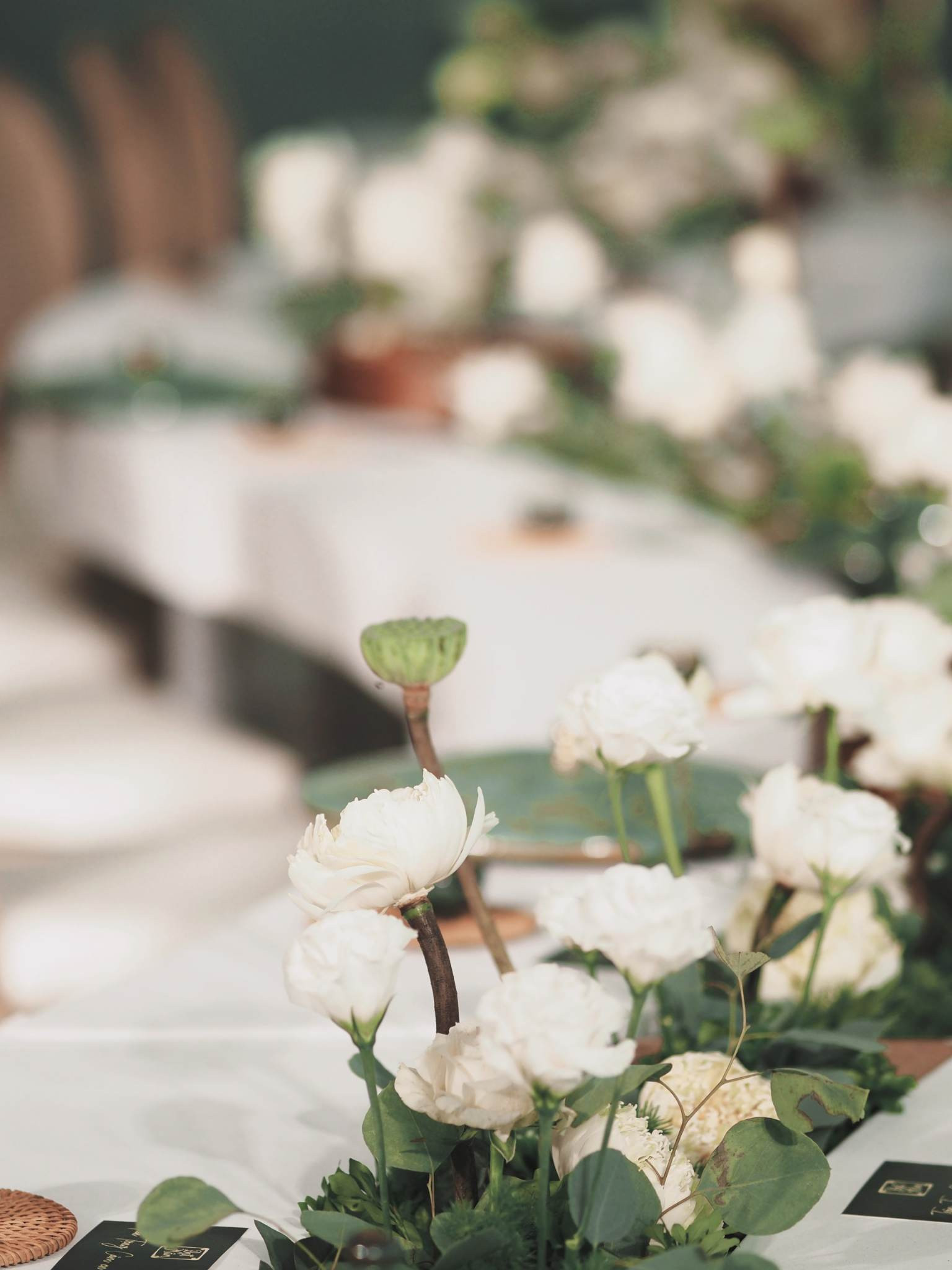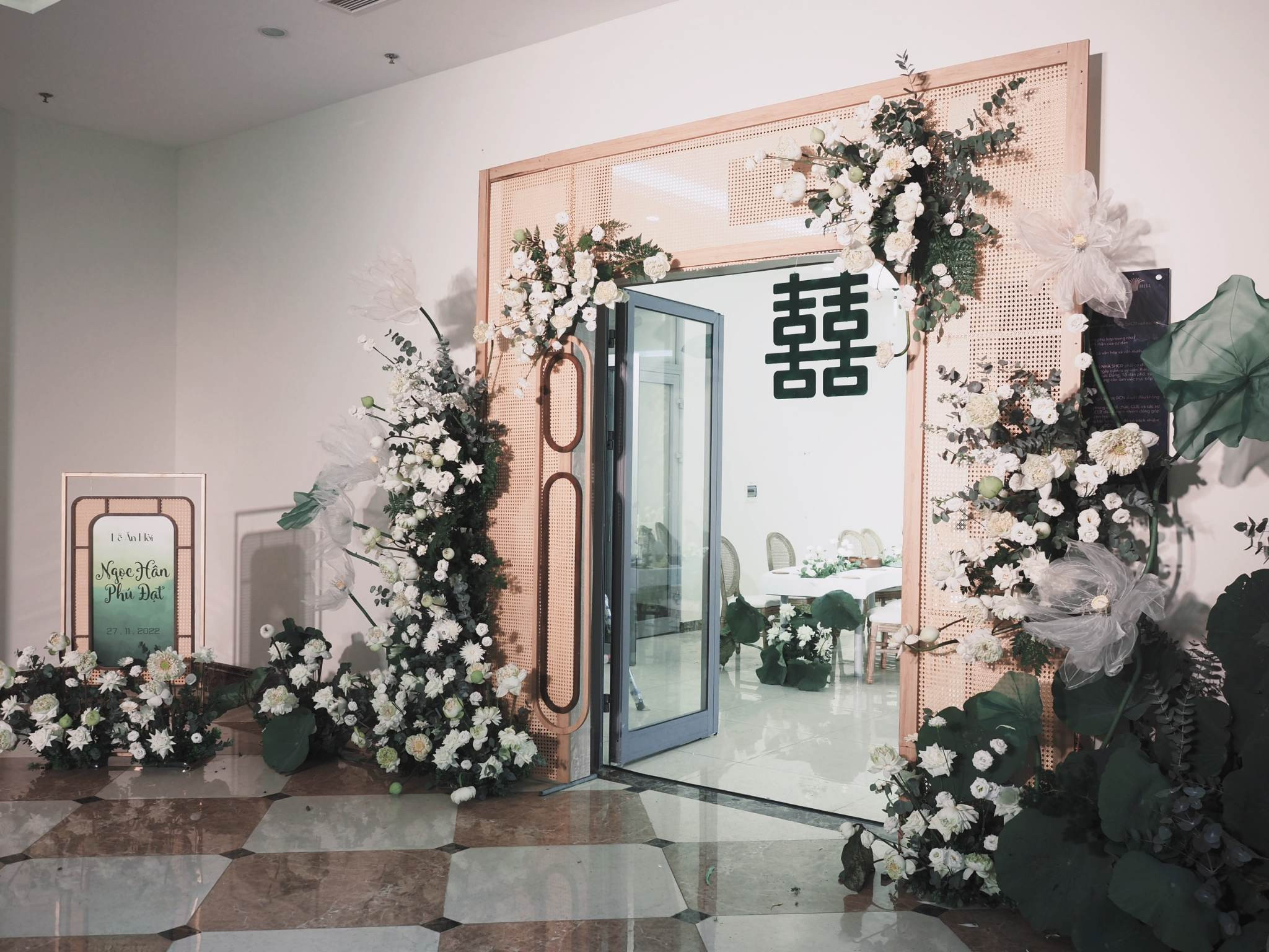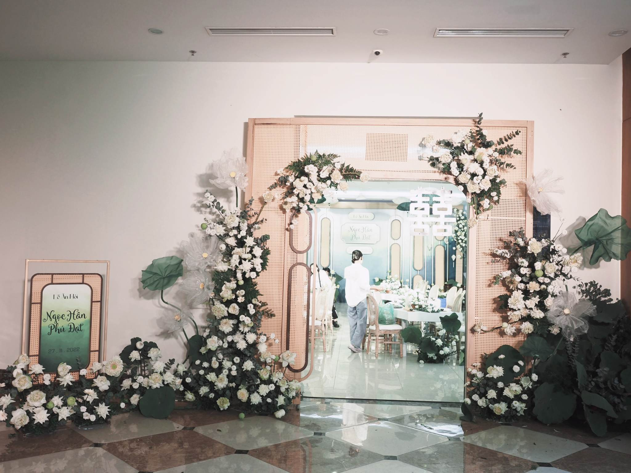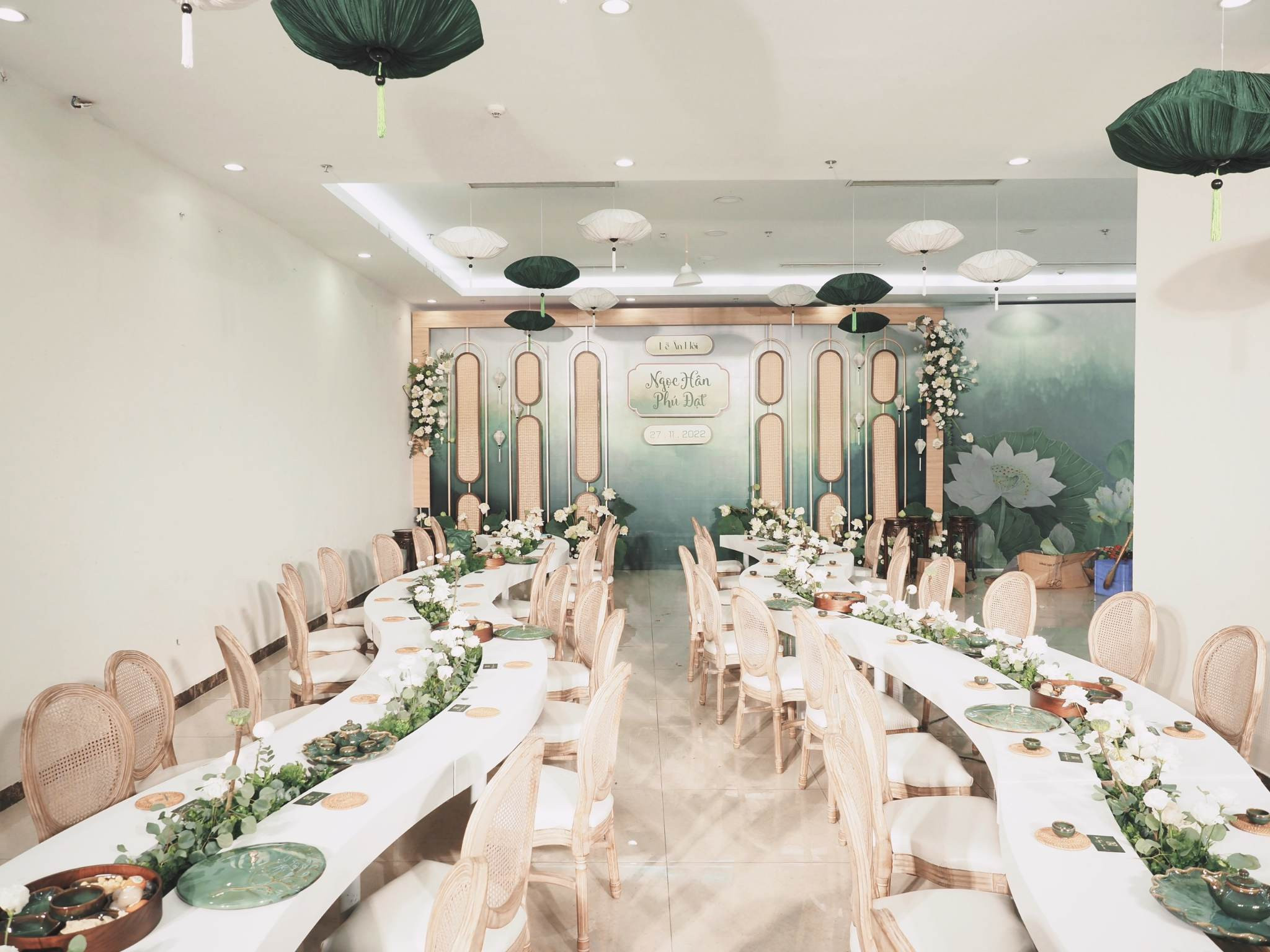 Hoa sen được sử dụng là loại hoa chủ đạo. 500 bông sen được ê-kíp đặt trước 1 tháng và chăm sóc tại đầm vì tháng 12 đã hết mùa sen ở miền Bắc. Điểm nhấn của toàn bộ không gian lễ ăn hỏi là bộ bàn ghế uốn lượn được cách điệu từ hình ảnh dòng suối nhỏ thanh mát. Trên bàn, hoa hồng, hoa tường vi… với tông trắng được sắp xếp ở giữa bàn để tạo nên dòng suối hoa thơ mộng.