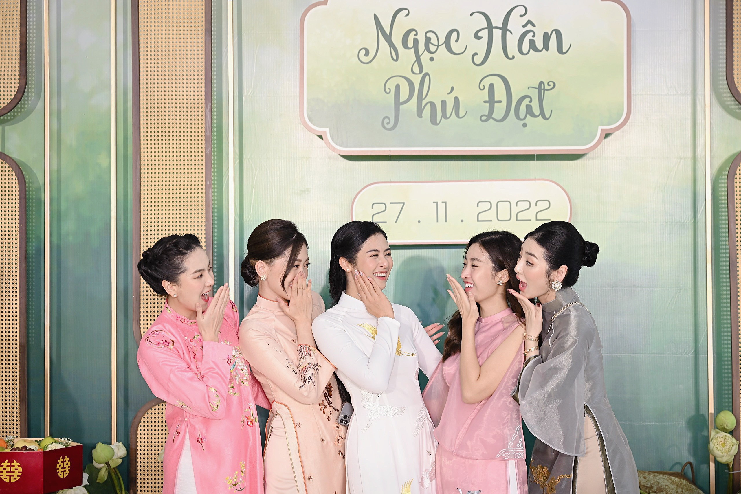 Dàn bê tráp nhà trai gồm bạn bè, anh em thân thiết của chú rể Phú Đạt.Cô dâu Ngọc Hân cùng chú rể Phú Đạt chụp ảnh vui vẻ cùng dàn phù dâu gồm Ngọc Nữ, MC Quỳnh Hoa, Lương Thanh, Hoa hậu dân tộc Ngọc Anh, MC Hạnh Quyên.Ngọc Hân và chồng sắp cưới Phú Đạt diện áo dài trắng đôi do chính tay cô dâu thiết kế. Cả hai không giấu nổi niềm hạnh phúc trên gương mặt.Ngọc Hân chọn lối trang điểm, làm tóc nhẹ nhàng làm nổi bật nét đẹp truyền thống của phụ nữ Việt Nam.