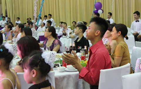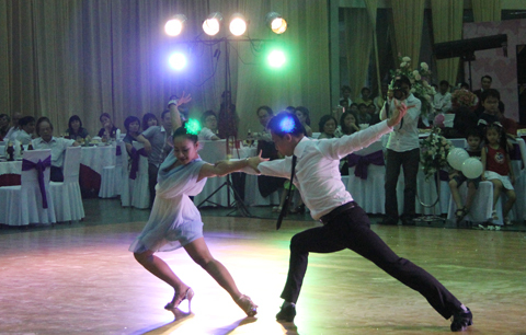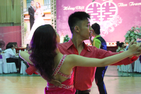 Không chỉ những kiện tướng dancesport nổi tiếng trình diễn mà nhiều khách mời (có già, có trẻ) - là "học sinh" của cô dâu Thu Trang và chú rể Hồng Việt cũng nhiệt tình lên khiêu vũ. Đám cưới giống như một đêm vũ hội với sự kết hợp của âm nhạc, ánh sáng và những vũ điệu nóng bỏng, lãng mạn.