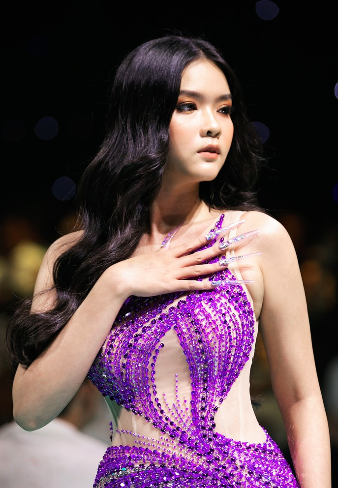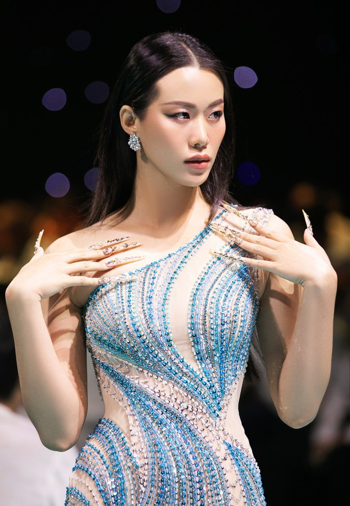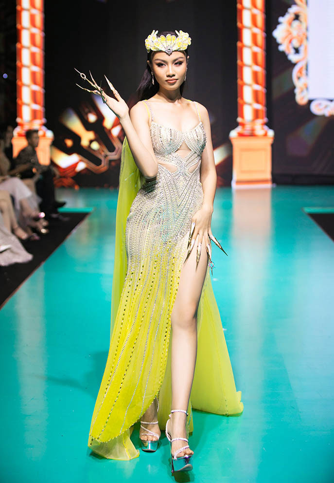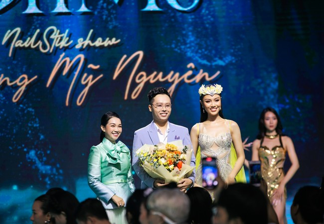 Lê Hoàng Phương - top 5 Hoa hậu Hoàn vũ Việt Nam 2022 mở màn bộ sưu tập 'Dạ hội' của NTK Nguyễn Minh Tuấn. Người đẹp diện bộ váy tông tím với những chi tiết cắt xẻ, đính đá nổi bật. Cô khéo kết hợp với bộ nail vân nổi được làm kỳ công.Các bộ váy áo được kết hợp hài hòa với bộ móng cùng tông màu tạo hiệu ứng thị giác đẹp mắt. Mẫu váy áo của Nguyễn Minh Tuấn toát lên tinh thần quyến rũ, kiêu sa của người phụ nữ. Các chất liệu sequin, hạt cườm được anh đính kết thủ công trên các bộ bodysuit.Một tác phẩm nail trình diễn trong show mất khá nhiều thời gian để hoàn thành với sự nỗ lực của đội ngũ ê-kíp hàng chục người. Các bộ nail được được đắp khối tỉ mỉ, công phu góp phần tôn vẻ đẹp của người phụ nữ bên cạnh váy áo. Các kiểu móng tay đa dạng về họa tiết, chất liệu như đắp pha lê, kim tuyến, dập nổi hoa 3D... tạo sức hút cho những người mẫu trình diễn. Giữa nhà thiết kế và các nghệ nhân nail có những buổi trao đổi, thảo luận để đảm bảo truyền tải đúng tinh thần BST. Dù có thiết kế cầu kỳ, các bộ nail không tốn nhiều thời gian khi được đeo lên tay. Á hậu Thủy Tiên là vedette của BST 'Dạ hội'. Cô khoe nét kiều diễm và đường cong nóng bỏng với chiếc đầm dạ hội ôm sát người. Điểm nhấn chính chính là bộ nail tông vàng - trắng bắt mắt, được thực hiện với kỹ thuật tráng gương, đắp ánh nhũ, kim tuyến, kết hợp đính kết trang sức. Á hậu 2 Hoa hậu Hoàn vũ Việt Nam 2022 chụp ảnh kỷ niệm cùng NTK Nguyễn Minh Tuấn và nghệ nhân Pang Mỹ Nguyên sau khi kết thúc show diễn.