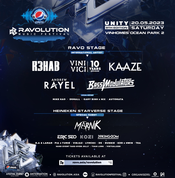 Pepsi presents Ravolution Music Festival Đơn vị Tổ chức: Công ty Cổ phần Anternation & DA Organization Địa điểm tổ chức: Dự án Vinhomes Ocean Park 2, xã Nghĩa Trụ, huyện Văn Giang, tỉnh Hưng Yên. Thời gian: 15h - 23h, thứ bảy ngày 20/5/2023. |