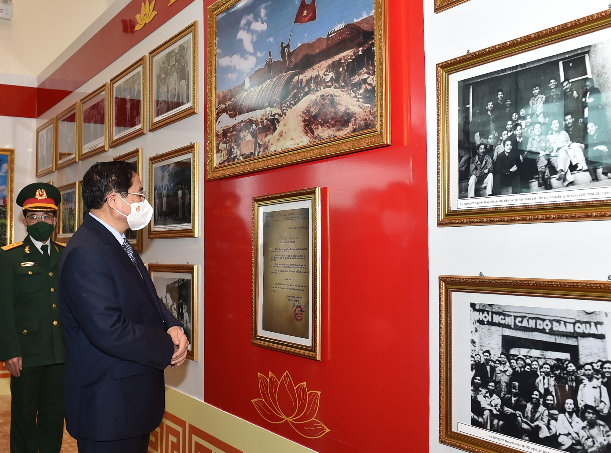 Thủ tướng xem không gian trưng bày ảnh về cuộc đời và sự nghiệp của đại tướng Võ Nguyên Giáp. Ảnh: VGP/Nhật Bắc |