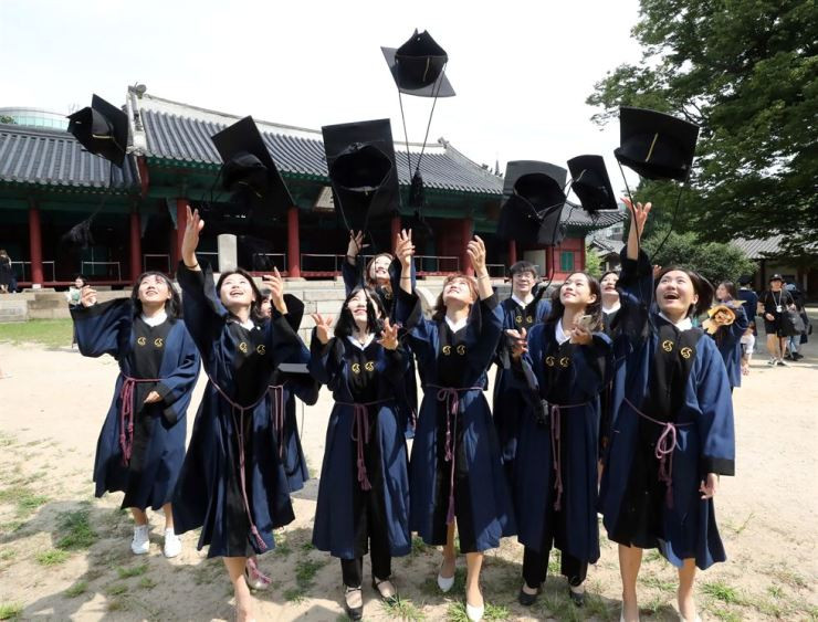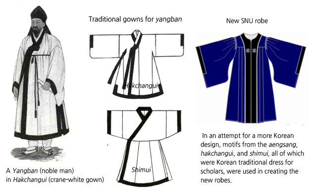 Tại Hàn Quốc, phần lớn các lễ phục tốt nghiệp được sử dụng có thiết kế giống các trường tại châu Âu và Mỹ. Tuy nhiên, năm 2005, Đại học Chung-Ang - ngôi trường nổi tiếng hàng đầu đã thay đổi mẫu áo tốt nghiệp bậc tiến sĩ theo màu truyền thống của Hàn Quốc. Cụ thể, áo có màu xanh ngọc bích dựa trên "áo choàng dài màu trắng hình chim hạc" từ triều đại Joseon.
