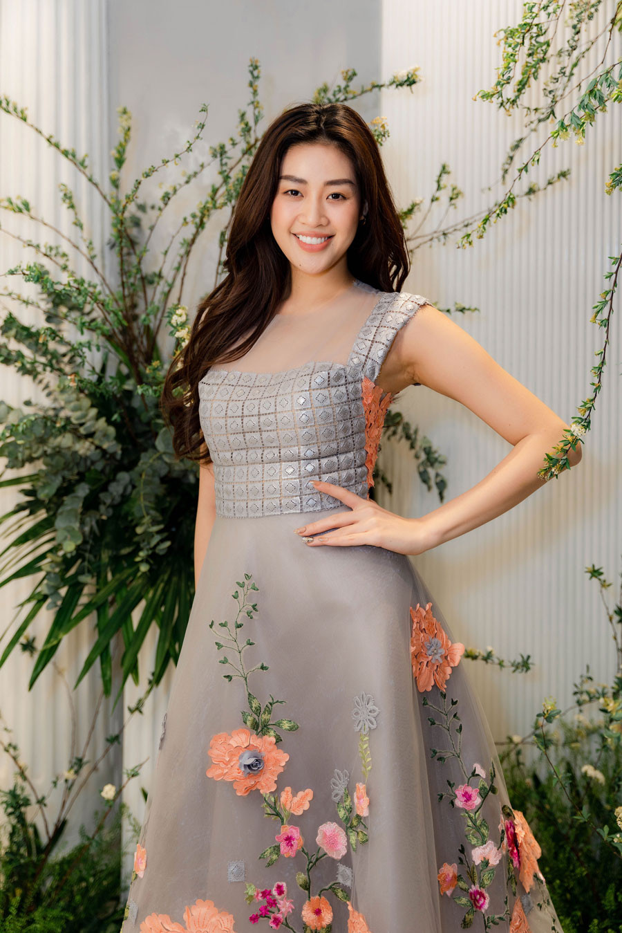 Hoa hậu Khánh Vân chọn bộ cánh chất liệu voan bay bổng, đắp hoa nổi bằng kỹ thuật thủ công. Phần tùng váy xòe nhẹ, tôn dáng, sang trọng và lịch sự để cô tự tin xuất hiện trong những dịp đặc biệt.