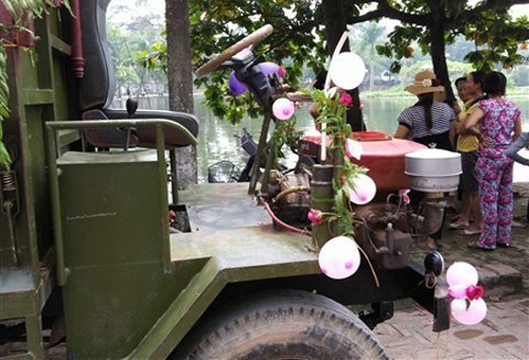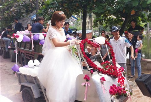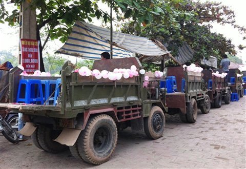 | Toàn cảnh xe điện và xe công nông để rước dâu. |