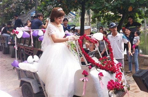Bạn bè, anh em của cô dâu chú rể được chở trên chiếc xe công nông có gắn đầy bóng bay, hoa hồng và hai hàng nghế nhựa. Đặc biệt, trên đầu xe còn có một bông hoa hồng thắm và hai chiếc kẹo.