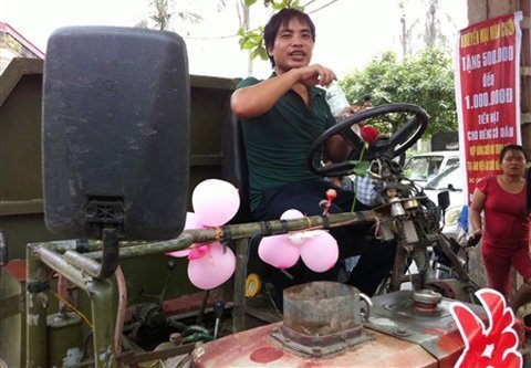 Chiếc xe công nông hằng ngày là phương tiện dùng để phục vụ cho sản xuất, nhưng nay chiếc xe công nông này được dùng để làm phương tiện để cùng rước dâu.