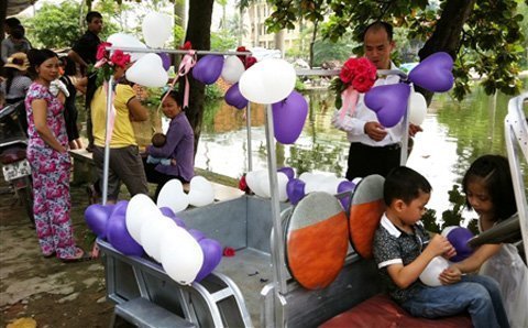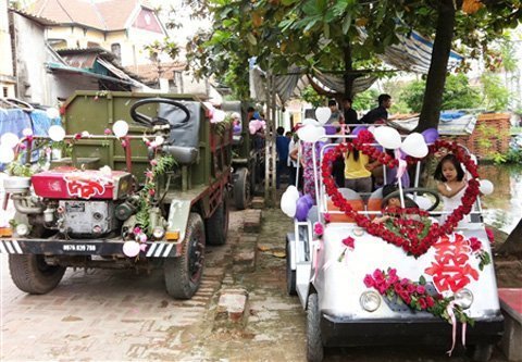 Trong lúc nhiều bạn trẻ tổ chức đám cưới với quy mô hoành tráng, thì cô dâu chú rể ở ngoại thành Hà Nội này lại có cách đón dâu khá đặc biệt, vừa đơn giản, tiết kiệm với màn rước dâu bằng xe điện, xe công nông.