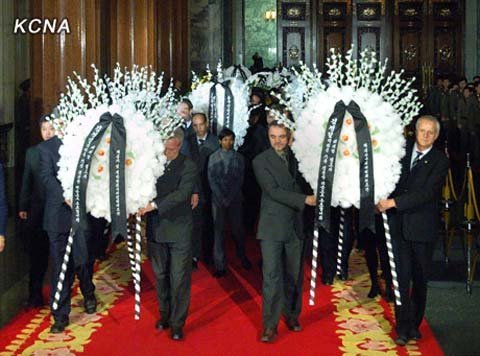 Mang vòng hoa vào viếng ông Kim Jong-il.