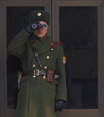 Một lính gác của Triều Tiên nhìn qua ống nhòm về phía biên giới Hàn Quốc trong ngày đưa tang Chủ tịch Kim Jong-il