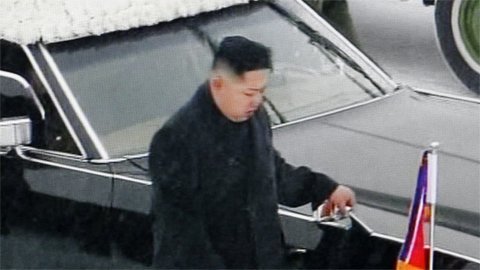 Xe chở linh cữu của Chủ tịch Kim Jong-il. Con trai của Chủ tịch Kim là Kim Jong-un (hàng đầu, bên phải xe) dẫn đầu.
