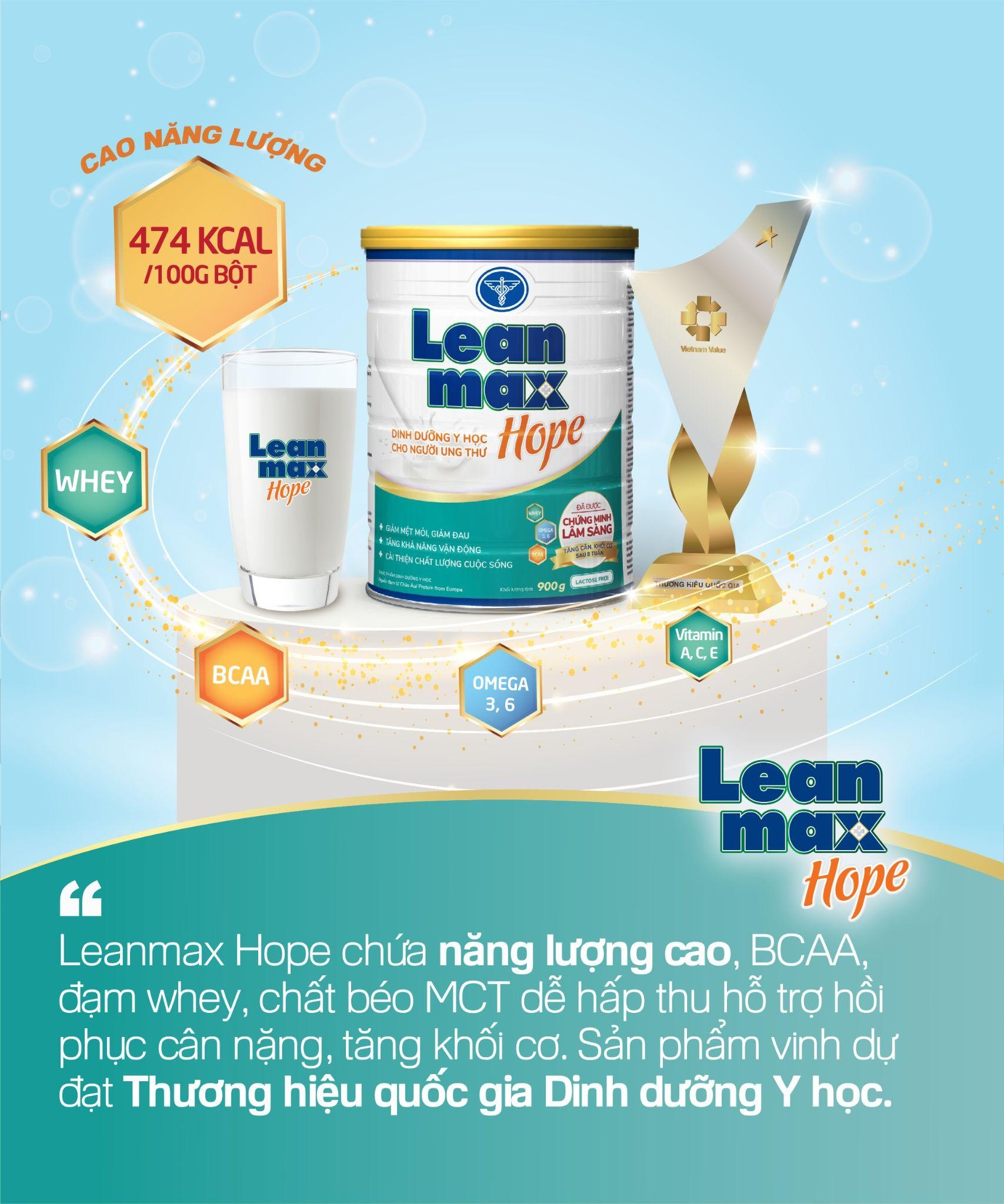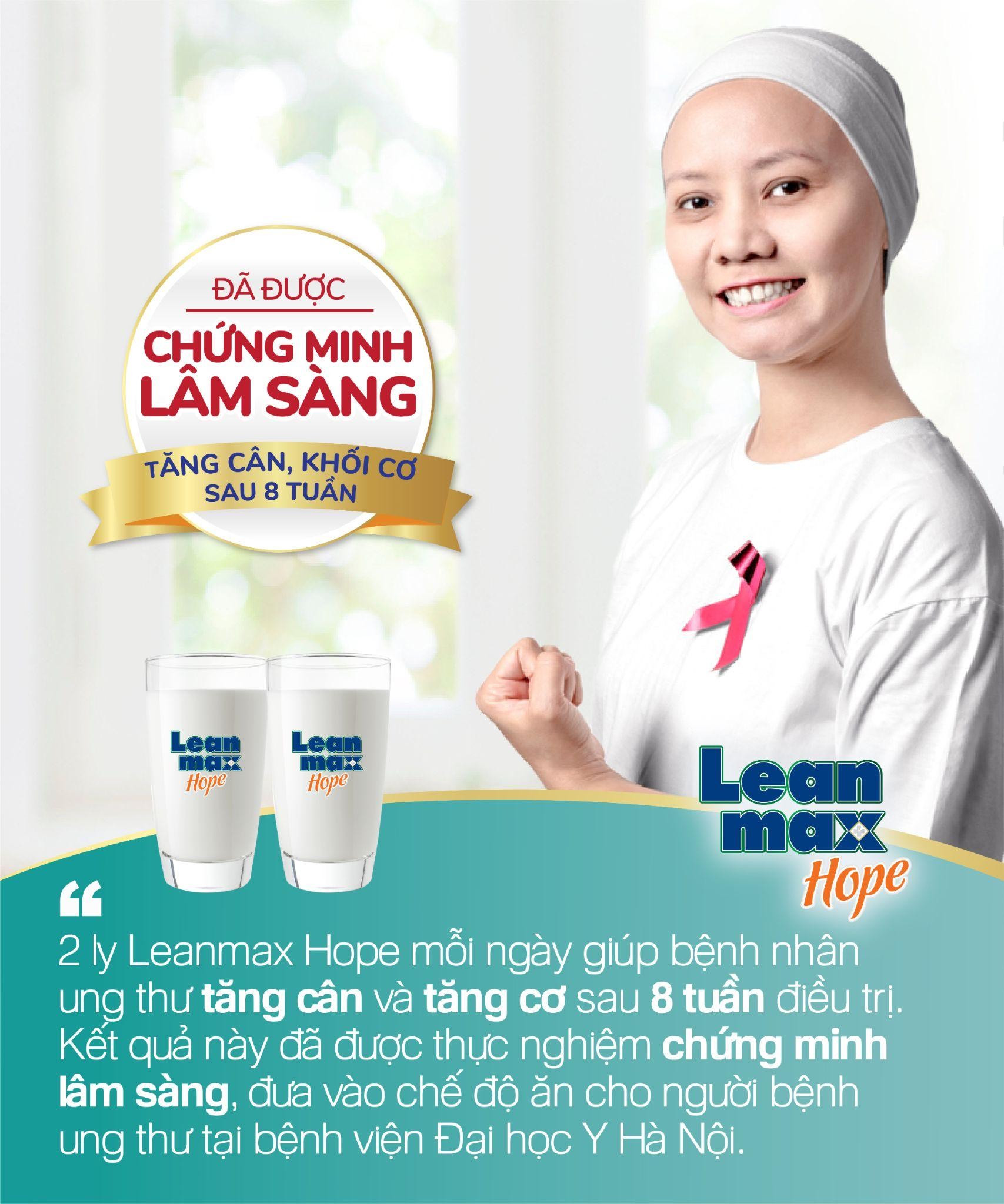 Theo các chuyên gia, dinh dưỡng chuyên biệt giúp tăng cân, tăng cơ đóng vai trò quan trọng hỗ trợ điều trị ung thư. Leanmax Hope là sản phẩm dinh dưỡng chuyên biệt cho người ung thư, đã được thực nghiệm chứng minh lâm sàng, đưa vào chế độ ăn cho người bệnh ung thư tại Bệnh viện Đại học Y Hà Nội.