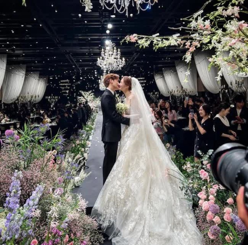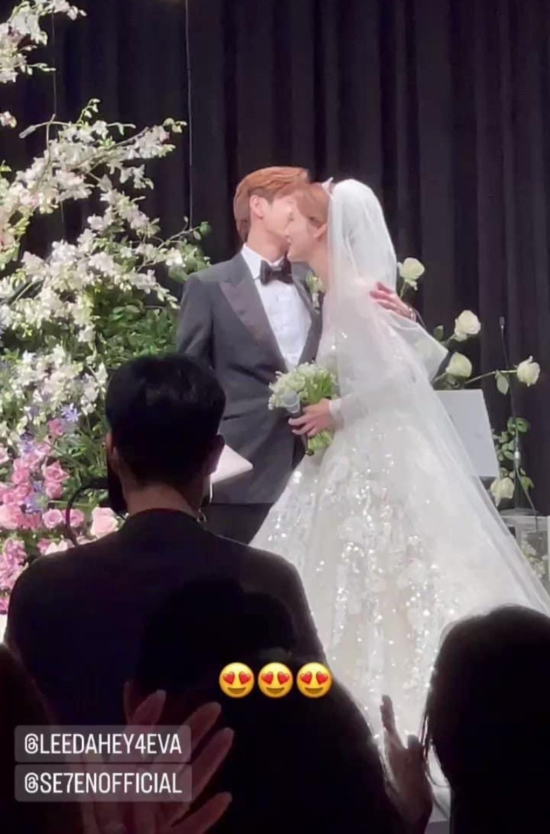 Lee Da Hae xinh đẹp trong bộ váy cưới trắng tinh khôi còn chú rể Se7en điển trai với vest lịch lãm. Không gian đám cưới được trang trí hoa tươi đẹp như thế giới cổ tích.