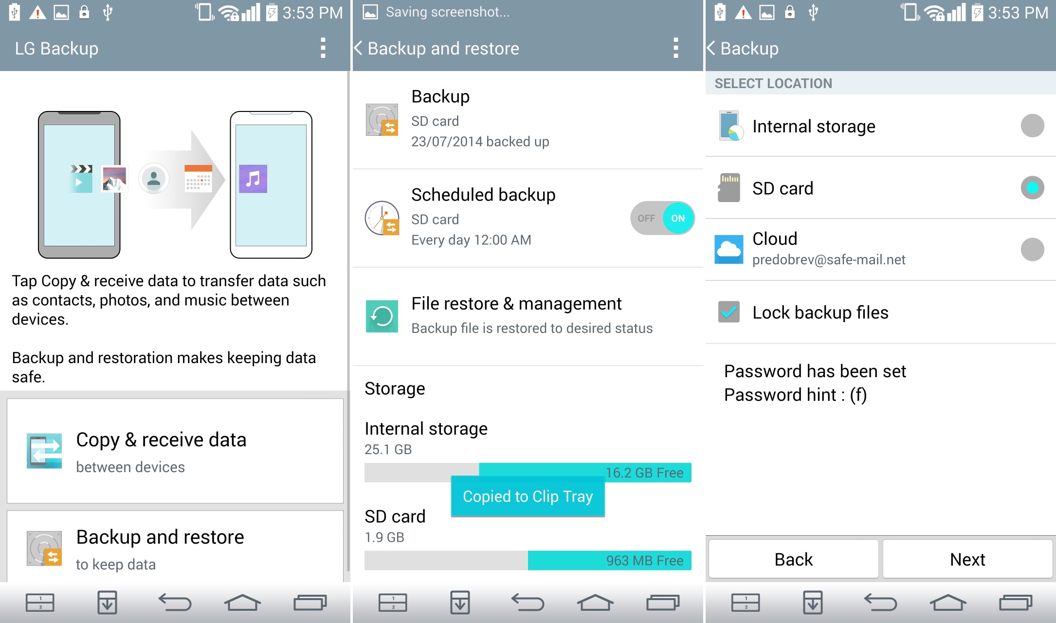 LG G3 được trang bị dịch vụ “LG Backup”, cho phép chạy, truyền và khôi phục thủ công/theo lịch dữ liệu điện thoại. Các bản đồng bộ được lưu thành file trong bộ nhớ máy, thẻ nhớ hoặc tài khoản LG Cloud. Để bảo mật tốt hơn, chúng cũng có thể được khóa bằng mật khẩu hay pattern.