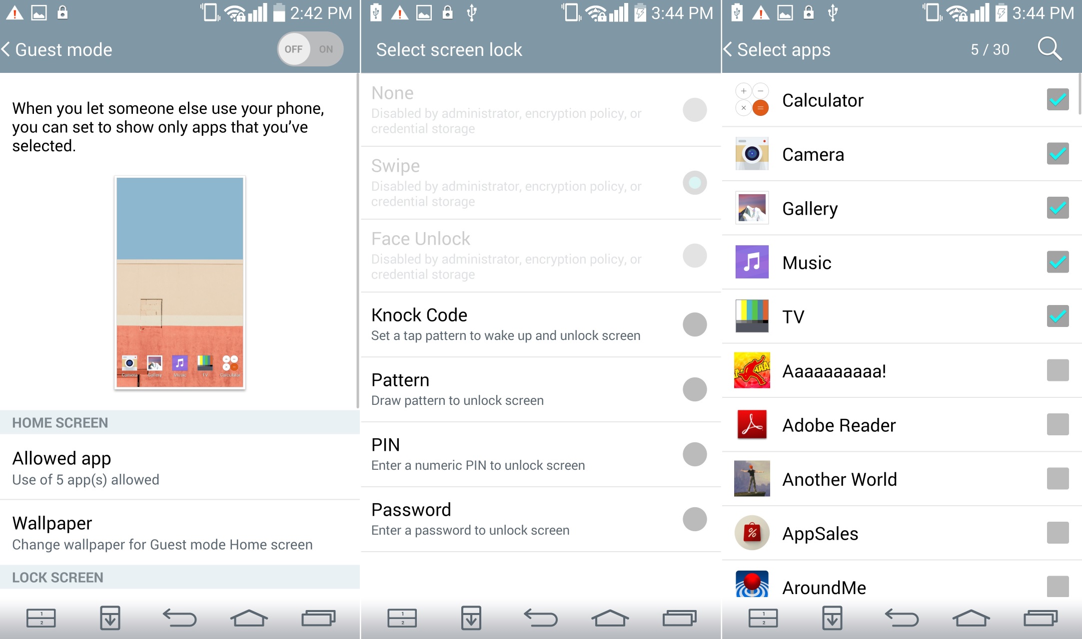 Khi muốn cho ai mượn máy, bạn có thể dùng LG Guest Mode để thiết lập các khu vực hạn chế, không cho khách xem. Sau khi kích hoạt chế độ này, khách sẽ mở khóa bằng một phương thức khác và chỉ dùng được tối đa 5 ứng dụng do chủ nhân thiết bị lựa chọn.
