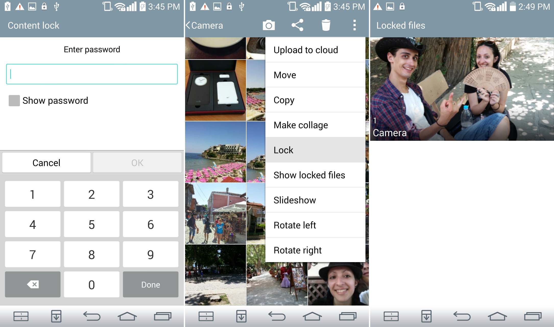 LG Content Lock cho phép bạn khóa một số file trong Gallery bằng mật khẩu hoặc pattern xác định. Để kích hoạt tính năng này, truy cập Settings > General > Security > Content lock. Điện thoại sẽ đề nghị bạn chọn mật khẩu hoặc pattern để khóa file. Dùng mật khẩu hoặc pattern này để khóa file bằng cách vào Gallery, bấm vào ba chấm vuông, chọn Lock.