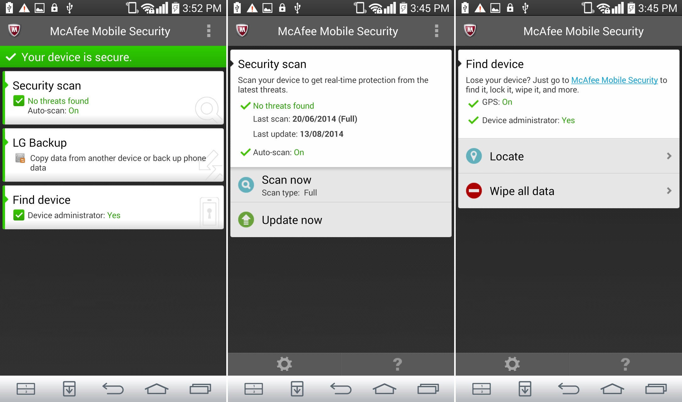 Để sử dụng nó, hãy mở ứng dụng từ màn hình chính, dùng tính năng Security scan để quét mã độc, Find device để học cách xác định vị trí của LG G3 từ website McAfee hoặc gửi tin nhắn. Tùy chọn xóa dữ liệu cũng có mặt và bạn phải đặt một mật khẩu gồm 6 chữ số để dùng trong trường hợp khẩn cấp.