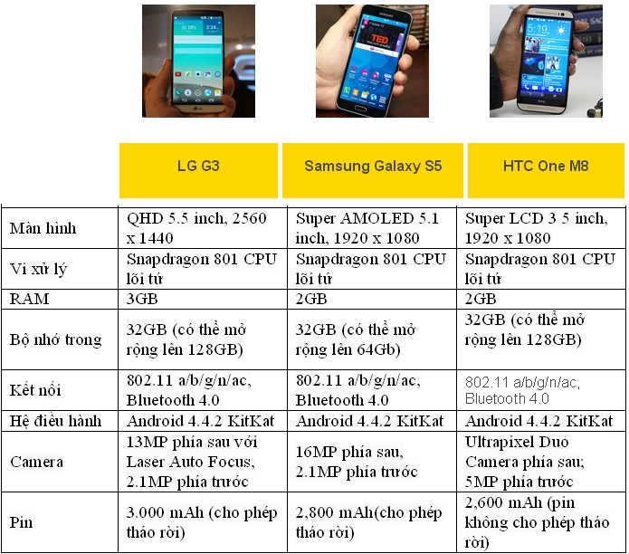 Về các thông số phần cứng khác, LG G3 có vẻ nổi bật hơn một chút so với Galaxy S5 và One M8.