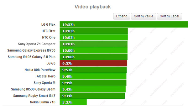 Ở bài kiểm tra về phát video, LG G3 cho kết quả tốt với khoảng 10 giờ sử dụng liên tục, thấp hơn hai đối thủ Sony Xperia Z2 và Samsung Galaxy S5.