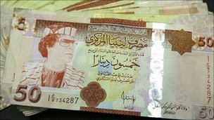 | Tờ tiền mệnh giá 50 dinar Libya có in chân dung Gaddafi sẽ không được sử dụng và bị thu hồi |
