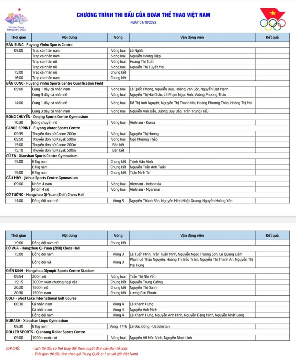 Đội tuyển bóng chuyền nữ sẽ gặp đội tuyển Hàn Quốc lúc 9h30; đội tuyển Bắn cung thi đấu ngày đầu tiên, bắt đầu từ 9h, các nội dung cung 1 dây nam, 3 dây nữ.