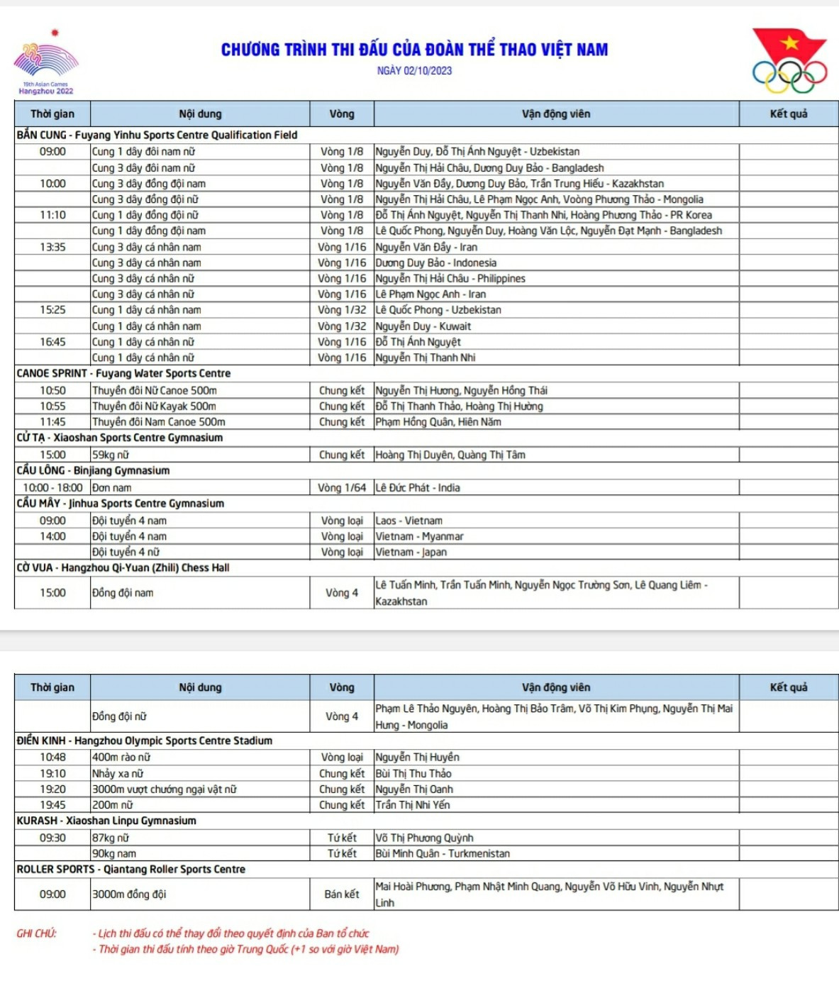 Lịch thi đấu ASIAD 19 của đoàn Việt Nam hôm nay 2/10