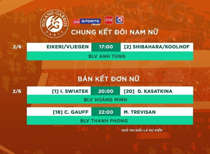 Cung cấp lịch thi đấu và kênh phát sóng trực tiếp giải quần vợt Pháp mở rộng - Roland Garros 2022 hôm nay (2/6), với vòng bán kết đơn nữ và chung kết đôi nam nữ.