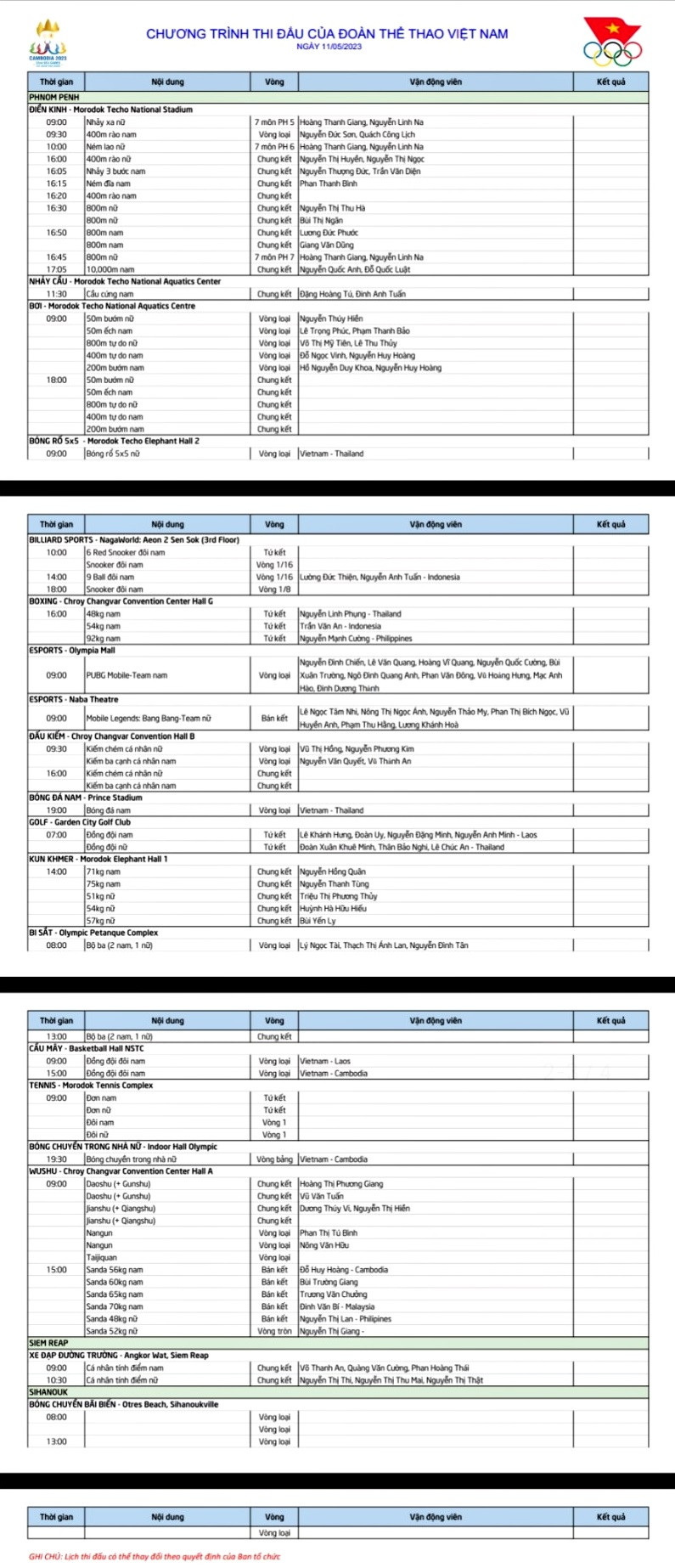 Lịch thi đấu SEA Games 32 của đoàn thể thao Việt Nam ngày 11/5