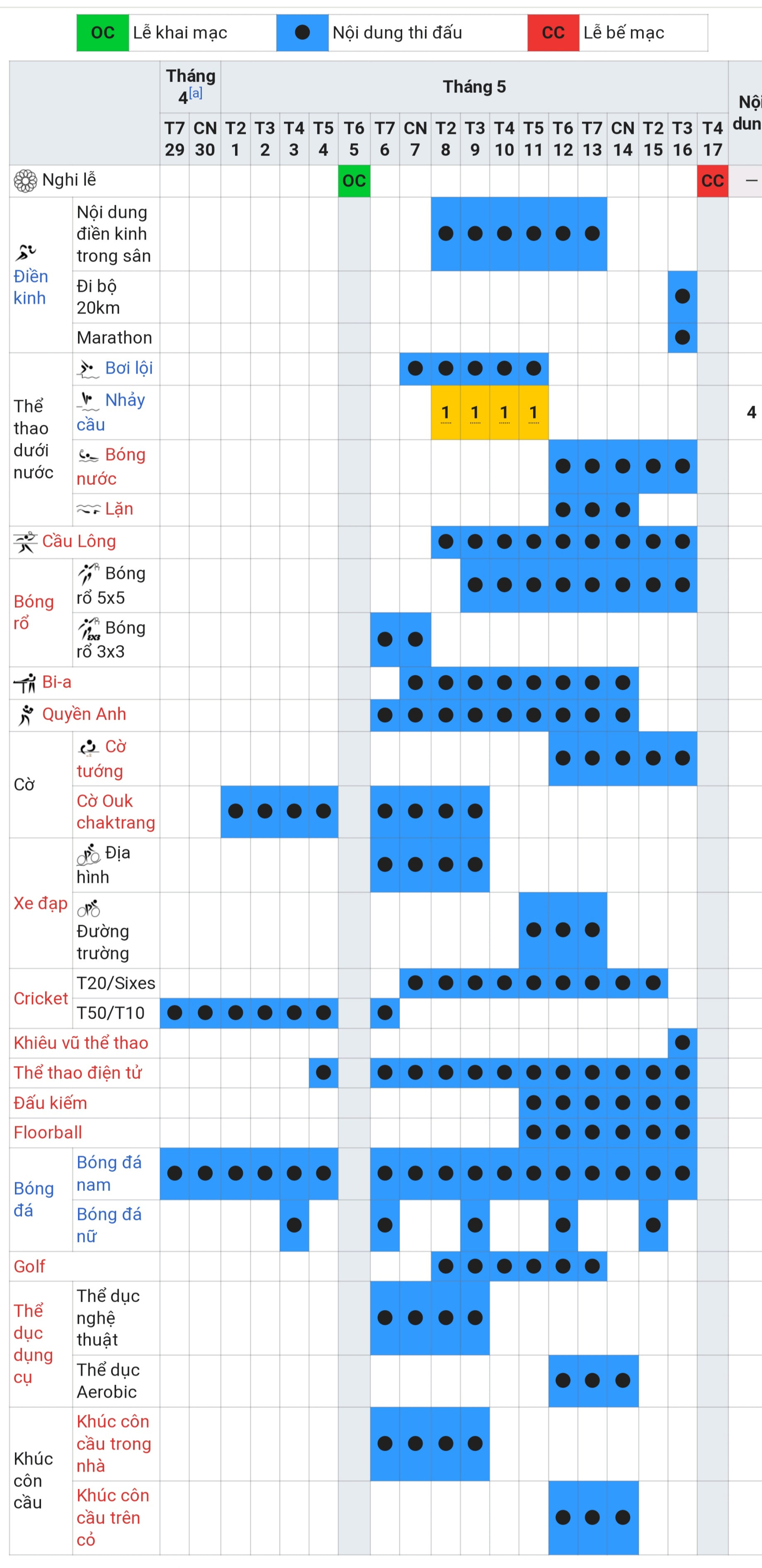 Trong khi đó, môn điền kinh - bộ môn có nhiều bộ huy chương và được quan tâm nhất diễn ra từ ngày 8 tới 13/5 nhưng phải tới ngày 16/5. Các nội dung đi bộ và marathon mới thi đấu để khép lại môn đấu. Còn môn Bơi sẽ thi đấu từ ngày 6 tới 11/5.