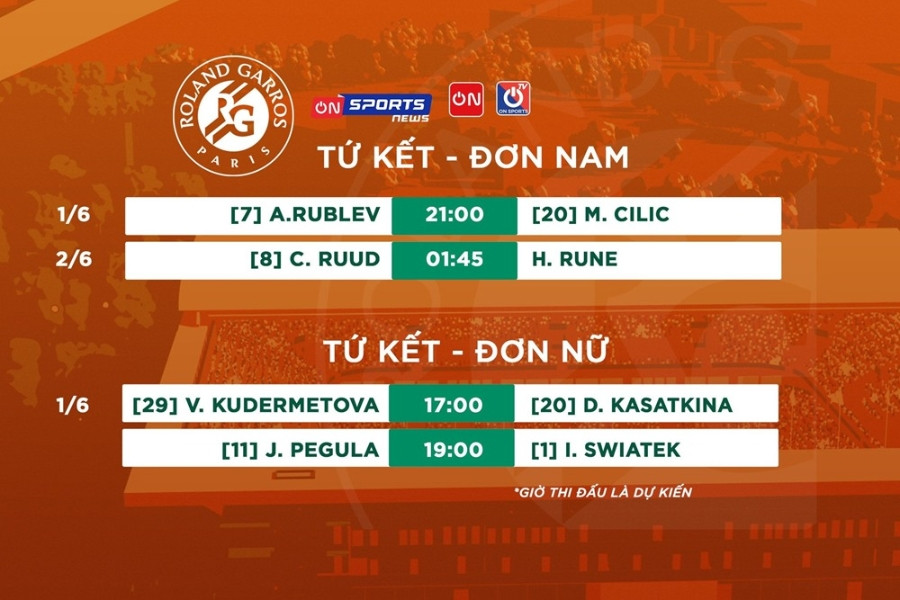 Lịch thi đấu và trực tiếp Pháp mở rộng 2022 hôm nay 1/6Cung cấp lịch thi đấu và kênh phát sóng trực tiếp giải quần vợt Pháp mở rộng - Roland Garros 2022 hôm nay (1/6), với vòng tứ kết đơn nam và đơn nữ.