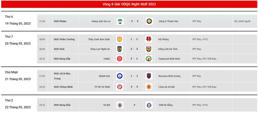 Lịch thi đấu và kết quả vòng 8 V-League 2023