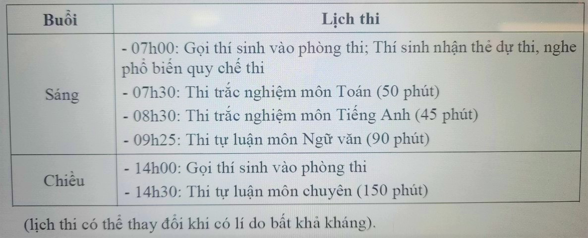 Buổi sáng, các thí sinh sẽ làm bài thi các môn Toán, Ngữ văn (chung), Tiếng Anh. Buổi chiều, làm bài thi môn chuyên.