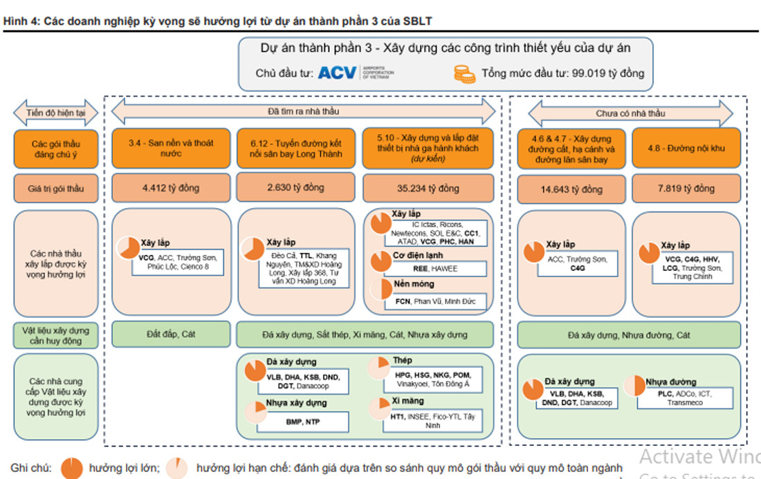 Đối với lĩnh vực vật liệu, các doanh nghiệp đá xây dựng sẽ được hưởng lợi chính. Theo Bộ Giao thông Vận tải, nhu cầu đá xây dựng cho thi công Sân bay Long Thành giai đoạn 1 lên tới 18 triệu m3, tương đương 56% công suất khai thác được cấp phép hàng năm của tỉnh Đồng Nai.