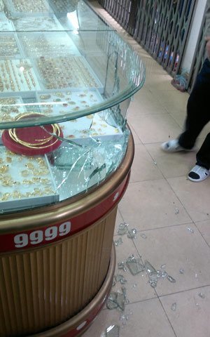 Khi vào đến tiệm vàng, đối tượng đã dùng búa đập vỡ cửa kính phía bên ngoài rồi cướp đi một số lượng vòng kiềng bằng vàng rồi tháo chạy ra xe máy đợi sẵn ở ngoài.