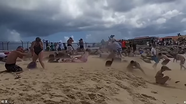 Trong lúc mọi người lấy điện thoại ra để sẵn sàng chụp lại khoảnh khắc máy bay cất cánh thì đột nhiên, một luồng khí mạnh từ động cơ khiến họ loạng choạng lùi sâu về phía sau, thậm chí một số du khách bị thổi bay xuống biển.