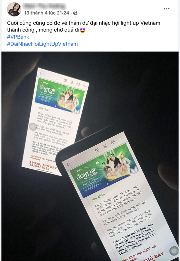 “U là trời có tin được không? Cuối cùng cũng săn được vé tham dự đại nhạc hội Light Up Viet Nam, hẹn gặp Sài Gòn sớm thôi nhé!” - Facebooker Chí Thành không khỏi bất ngờ lẫn vui mừng khi trở thành “người may mắn".