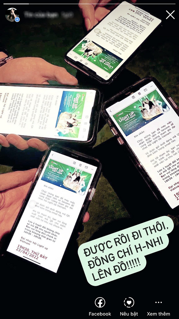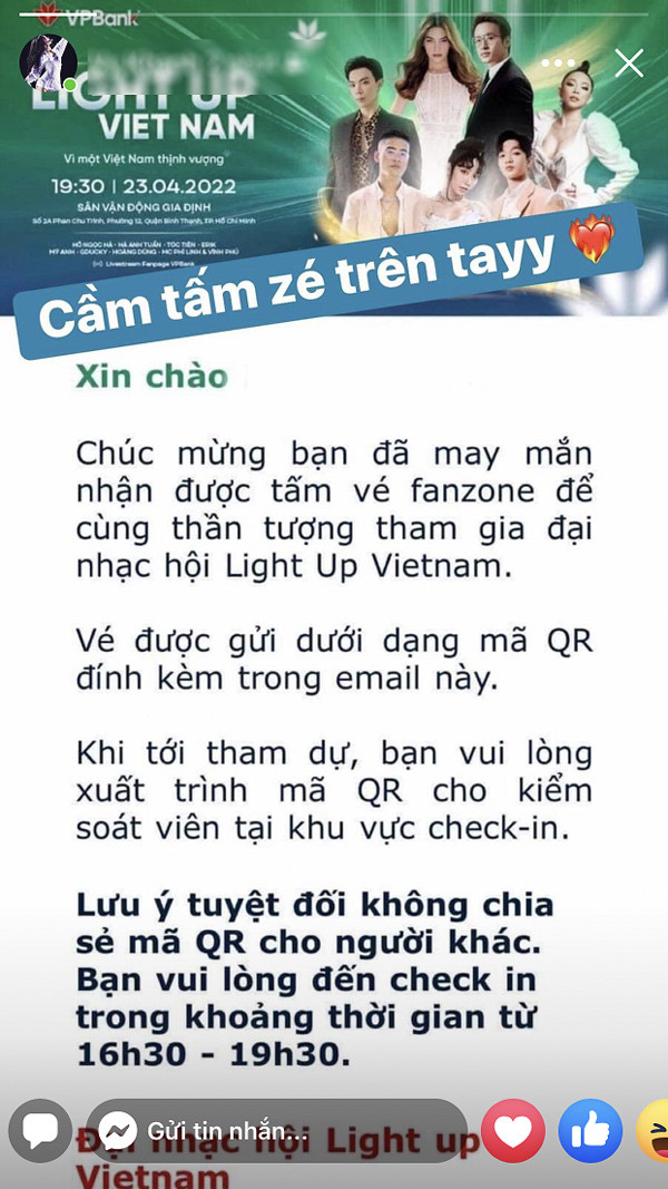 “Đã nhận vé Light Up Viet Nam, yên tâm lên đồ đi “quẩy” rồi! ‘Chú' Hà Anh Tuấn ơi, Hoàng Dũng ơi, em đến đây!" - Tài khoản Facebook Khanh Vy hào hứng chia sẻ trên trang cá nhân.