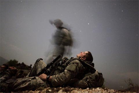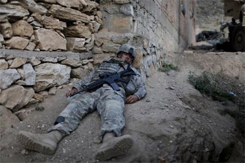 Một binh sĩ Mỹ chợp mắt gần Trại Honaker Mirake ở thung lũng Pesh, tỉnh Kunar, Afghanistan ngày 12/8/2009.